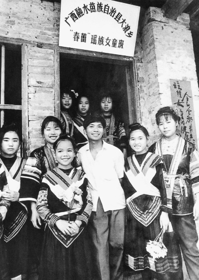 加强义务教育和扫盲工作,提高全民族科学文化素质,是全面建设小康社会的重要环节。图为广西融水苗族自治县大浪乡小学“春蕾”瑶族女童班的学生和她们的老师杨德成。杨德成曾被评为“全国春蕾计划十佳园丁”。