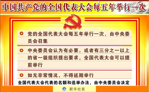 新华网北京10月15日电 党的全国代表大会每五年举行一次,由中央委员会召集。中央委员会认为有必要,或者有三分之一以上的省一级组织提出要求,全国代表大会可以提前举行;如无非常情况,不得延期举行。全国代表大会代表的名额和选举办法,由中央委员会决定。