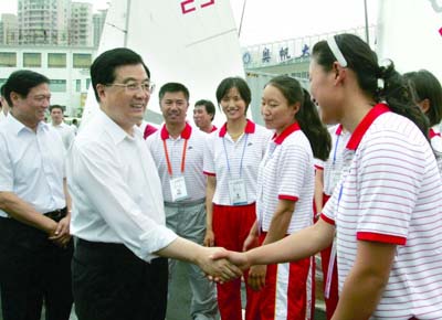 7月20日,胡锦涛来到奥帆赛训练基地,看望在这里训练的中国帆船队。胡锦涛鼓励大家:要有信心,要有斗志,在奥运会上赛出水平、赛出风格。