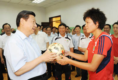 中国女子足球队正在国家体育总局秦皇岛训练基地训练,特地前往训练基地看望她们,同她们亲切交谈,