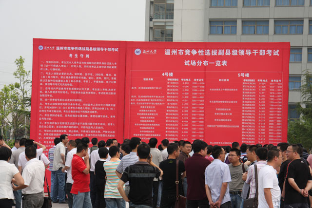 今天上午,温州市竞争性选拔副县级领导干部笔试在温州大学北校区瓯江学院如期举行。
