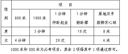 2、体能测试。以笔试成绩从高分到低分按选聘计划的1:2的比例进入体能测试。体能测试按普通人体育达标要求,如表: