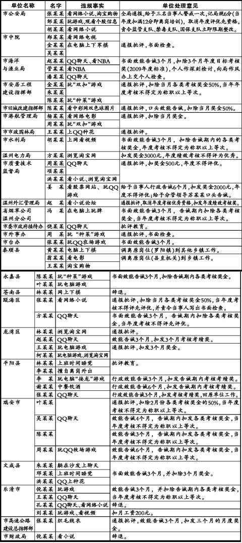 对于在明查暗访中发现的55名违规工作人员,市“转作风、优环境”专项活动领导小组办公室向各有关单位发整改通知书,责令各单位予以处理。各地、各部门给予了高度重视,对存有的违规现象迅速作出处理,并强化了内部监督管理。不少部门对办公电脑进行了全面检查,删除所有与办公无关的股票、游戏等软件,并利用技术手段对办公电脑实行股票、游戏软件、娱乐网站的屏蔽,从源头上杜绝上班期间玩游戏、炒股、看与工作无关的网页等问题。