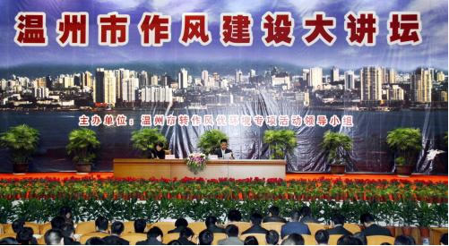 3月5日,由市转作风优环境专项活动领导小组举办的温州市“作风建设大讲坛”第一课——“加强作风建设,密切党群关系”,在市人民大会堂主会场开讲。讲座特邀中央党校教授、博士生导师张希贤主讲,市转作风优环境专项活动领导小组成员及办公室全体人员,市直有关单位中层以上领导干部及各县(市、区)转作风优环境专项活动领导小组组长、办公室主任参加讲座。