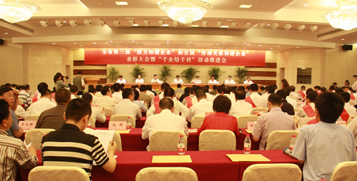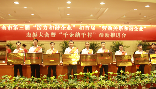 会议对万控集团有限公司等24家“活力和谐企业”和74家“劳动关系和谐企业”进行了表彰,正泰集团董事长南存辉上台代表全体“活力和谐企业”和“劳动关系和谐企业”宣读“千企结千村,共建新农村”活动倡议书。