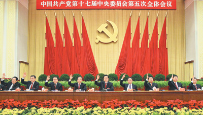 全会听取和讨论胡锦涛受中央政治局委托作的工作报告,审议通过《中共中央关于制定国民经济和社会发展第十二个五年规划的建议》