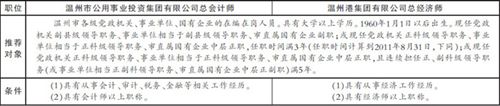 温州市委组织部昨天透露,经市委同意,对2个市属国有企业领导职位进行空缺预告,接受全市各级党组织和干部群众推荐提名人选。此次空缺职位分别是温州市公用事业投资集团有限公司总会计师和温州港集团有限公司总经济师。