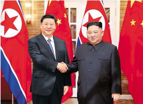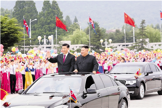 6月20日,中共中央总书记、国家主席习近平在平壤锦绣山迎宾馆同朝鲜劳动党委员长、国务委员会委员长金正恩会谈。双方一致同意,在新的历史起点上,中朝双方愿不忘初心、携手前进,共同开创两党两国关系的美好未来。