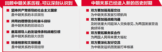 习近平强调,回顾中朝关系历程,可以深刻认识到:坚持共产党领导的社会主义国家是中朝关系的本质属性;共同的理想信念和奋斗目标是中朝关系的前进动力;最高领导人的友谊传承和战略引领是中朝关系的最大优势;地缘相亲和文缘相通是中朝关系的牢固纽带。我们坚信,中朝友谊符合两国人民心愿,符合两国根本利益,符合时代发展潮流,也是双方着眼长远大局作出的战略选择,不会因国际风云变幻而动摇。